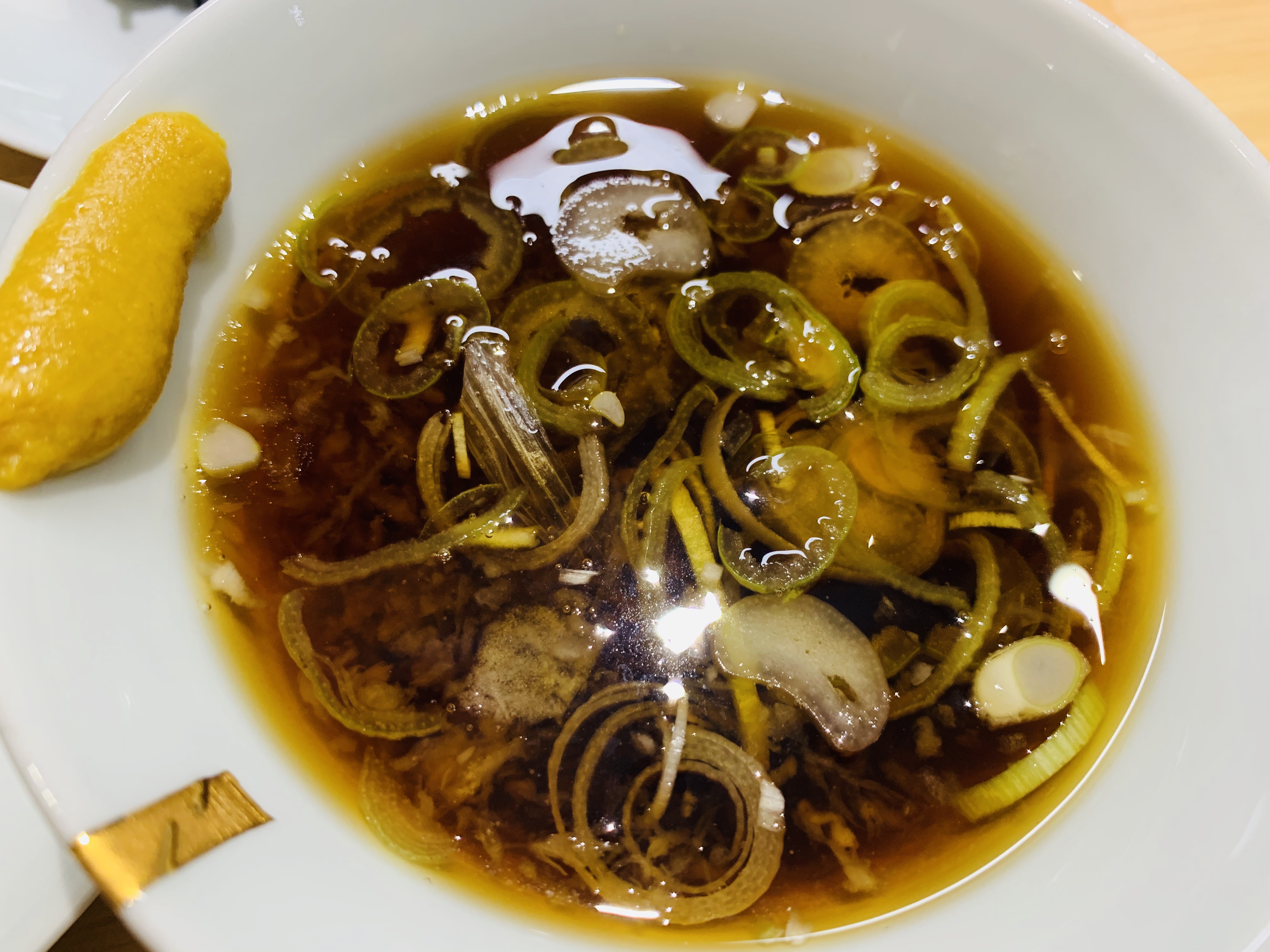 소바 육수와 겨자.