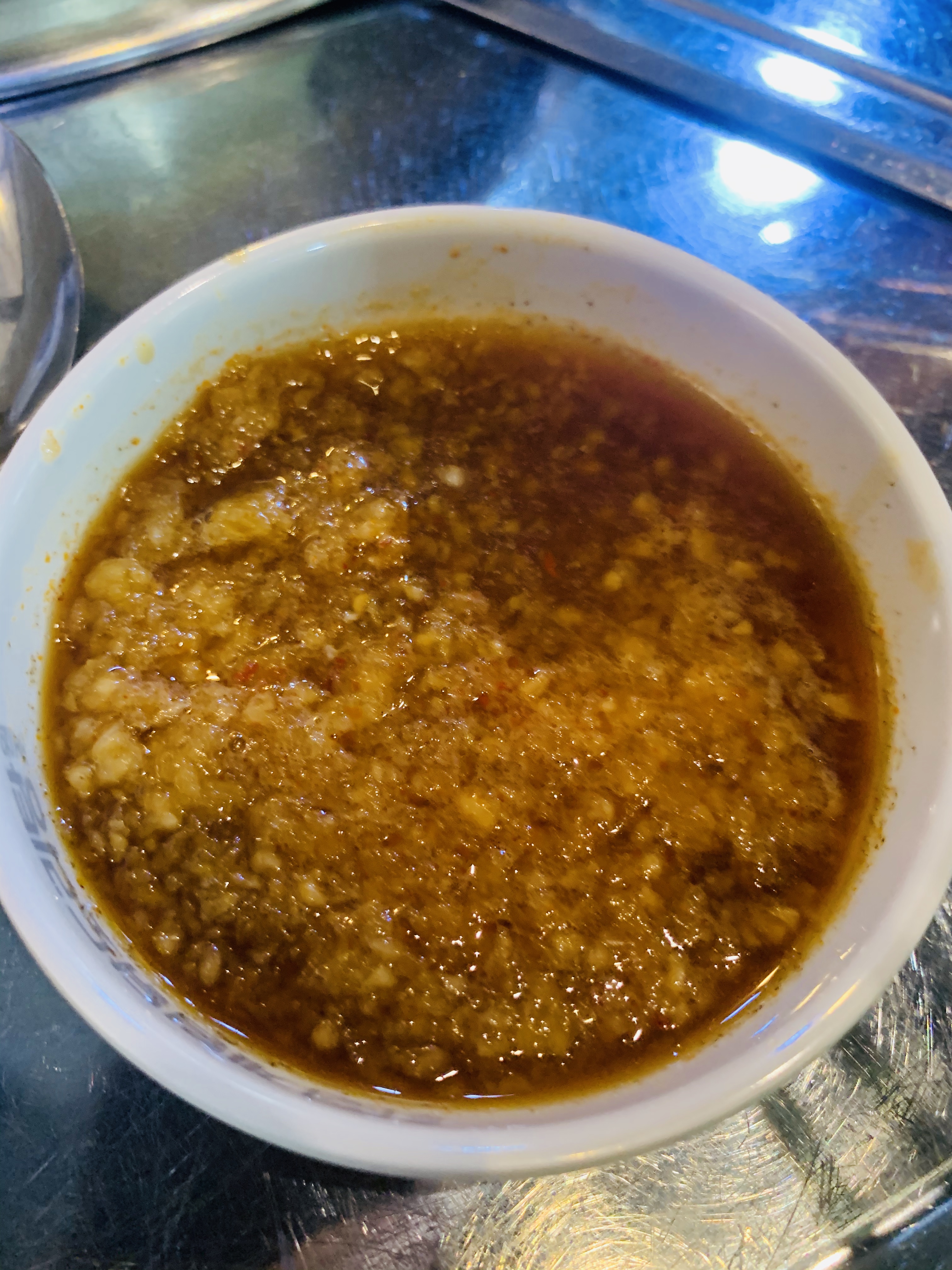 가운데 마늘을 반스푼 떠서 간장에 넣고 고기를 찍어 먹어요.