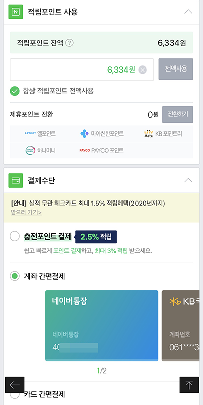 이 때, 네이버통장으로 충전하면 0.5% 추가 적립.