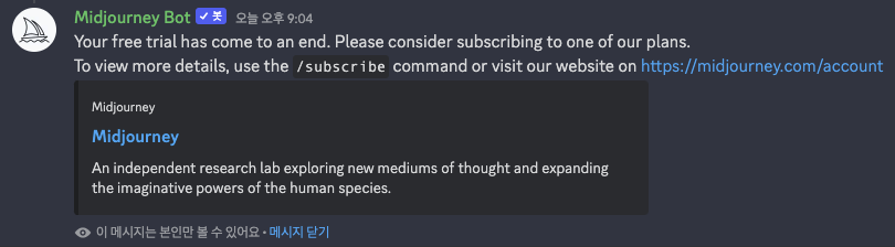 미드저니 사용시 주의할 점은 무료 유저는 25번만 사용할 수 있다는거에요. 한도를 초과하면 구독하라는 메시지가 떠요.