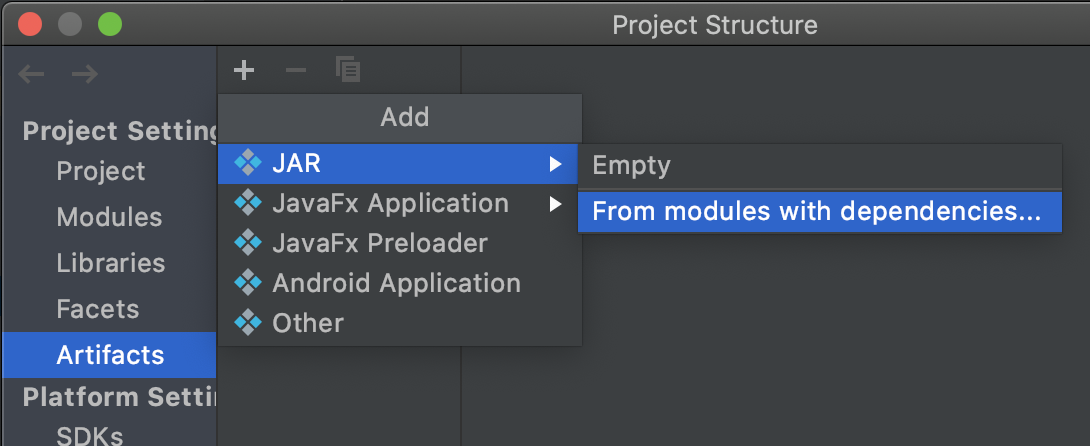 Artifacts 선택 > + 버튼 > JAR > From modules...